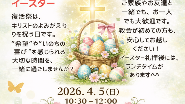 2026年のイースター礼拝のご案内です。日時:4月5日(日) 10時30分スタート礼拝後は、ランチパーティーを予定してい...